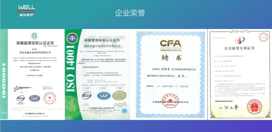 威尔地坪在国内设有深圳、成都、吉林三大材料生产基地,通过ISO9001质量管理体系及ISO14001环境管理体系认证。与施贝化学携手组建国内高端涂料涂装密封技术团队,设立深圳技术研发基地、苏州纳米科技园-国家级新材料研发中心,专业从事新材料基础研究、产品开发和技术应用。威尔以强大完善的产品及施工技术创新能力为公司快速发展的基石,专注新材料技术研发领域,目前已获得二十余项产品发明及实用新型专利,多项“地坪行业标准”起草单位。长期与国内外供应商、大型科研机构及院校合作,把高新技术转化为生产力,不断改进产品性能,从而保证了威尔产品的先进性、实用性、稳定性和环保性。