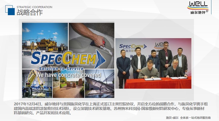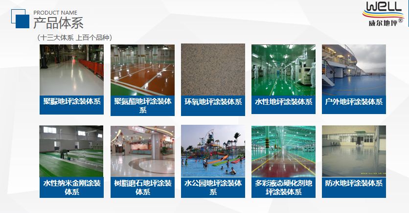 深圳市威尔地坪材料有限公司创建于2006年,为美国施贝化学旗下,集高端地坪涂装和特种涂装密封体系研发、生产、销售、设计及施工的国家级高新技术企业。公司生产的“威尔地坪”、“工匠”两大系列品牌,经过十多年的发展涵盖聚脲地坪涂装体系、聚氨酯地坪涂装体系、环氧地坪涂装体系、水性地坪涂装体系、户外地坪涂装体系、防腐地坪涂装体系、树脂磨石地坪涂装体系、水公园地坪涂装体系、多彩液态硬化剂地坪涂装体系、防水地坪涂装体系、防霉防腐墙面涂装体系、彩色路面地坪涂装体系及特种涂装密封体系十三大体系上百个品种。