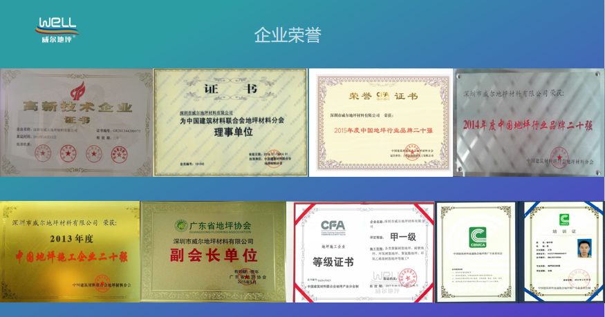 威尔地坪在深圳、成都、重庆、昆明、武汉、长沙、郑州、西安、兰州、长春、乌鲁木齐、天津、九江等地设有办事处,销售服务网络遍布全国大部分城市地区。为成千上万、遍布各行各业的企业提供了产品和相关服务,并荣获中国地坪行业协会甲一级施工资质、2014至2018连续五年获得中国地坪行业材料品牌20强、2013年获得中国地坪行业施工企业20强、中国地坪行业十佳工程,广东省优秀地坪施工商10强、中国地坪行业协会理事单位、广东省地坪协会副会长单位等众多荣誉称号。始终坚持“一流技术、一流产品和一流服务”的经营理念,根据客户的特定要求提供满意的解决方案。